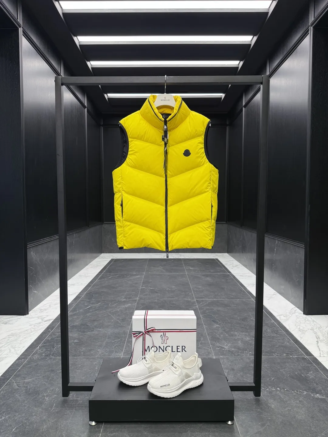 Includes the complete set of Moncler packaging including: the iconic airplane box, the shopping bag, the dust cover, the hanger, the thank you card, and ribbon.